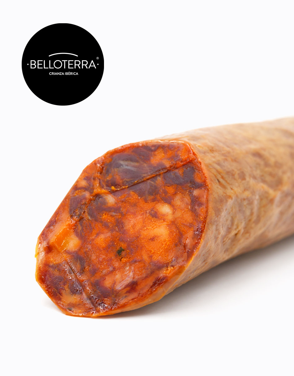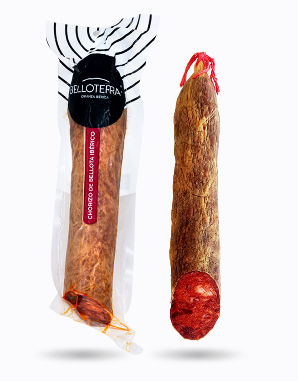Chorizo Ibérico de bellota elaborado y embutido en tripa natural con seleccionadas carnes magras, picado en la medida justa y con las mejores especias naturales, pimentón y sal. Son condimentados y macerados de forma artesanal durante el tiempo óptimo, para después embutirlos en tripa natural y posteriormente son curados lentamente en los secaderos naturales de Los Pedroches