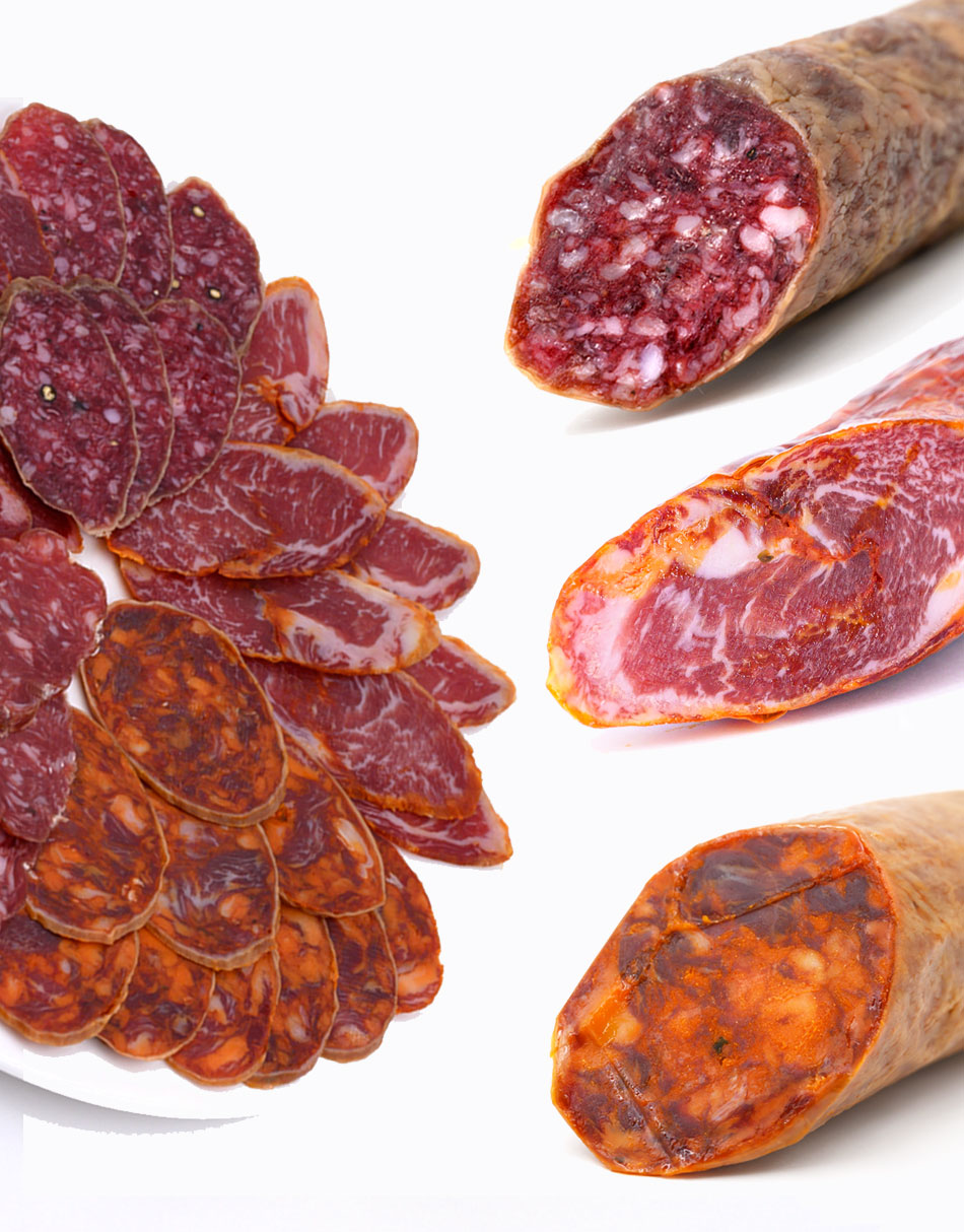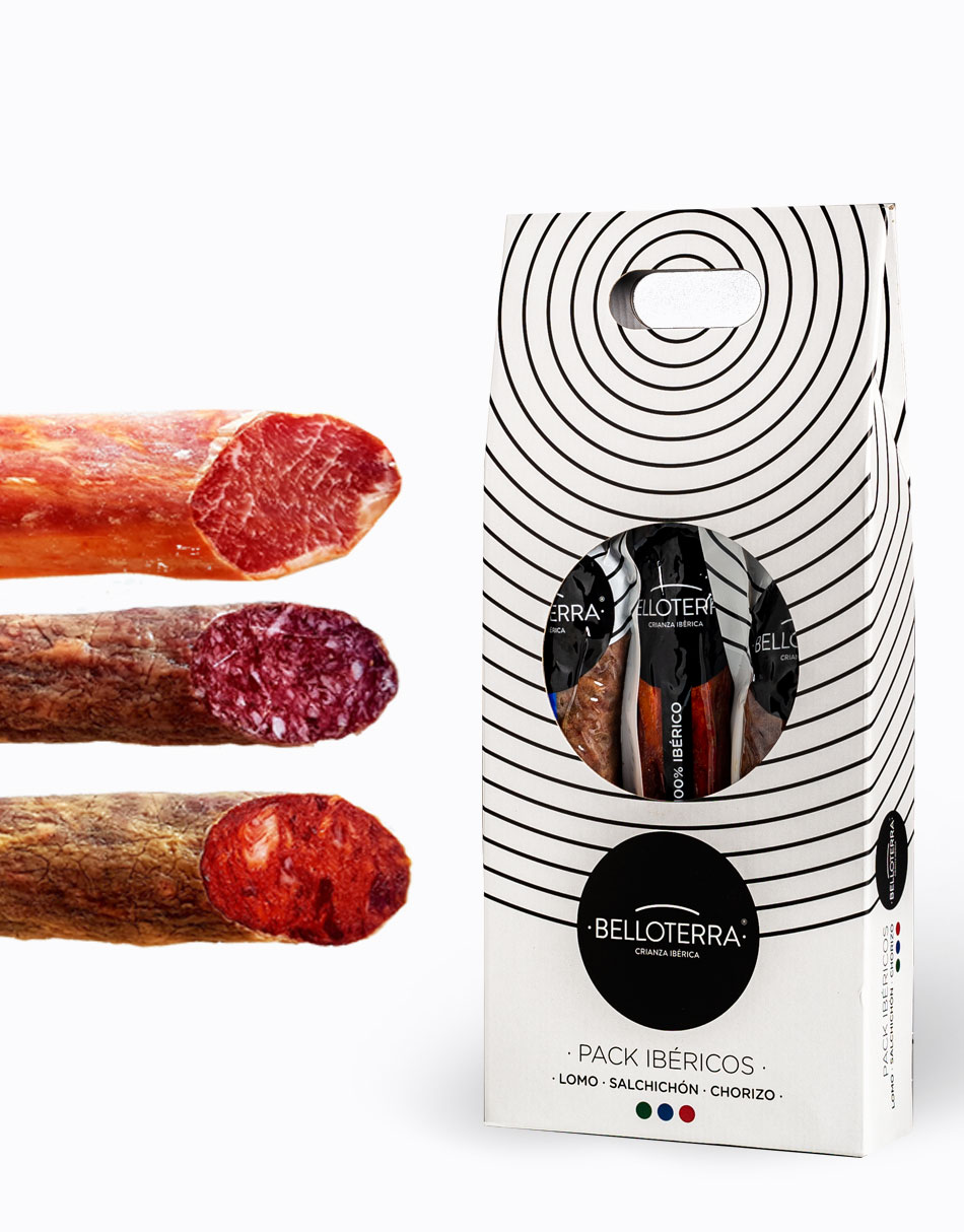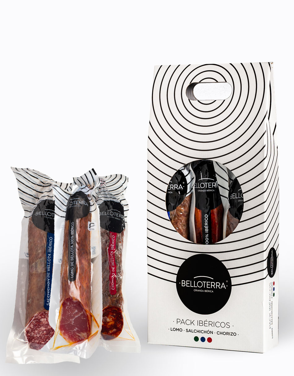 Surtido ibérico compuesto por tres embutidos tradicionales: la caña de lomo ibérico de bellota, salchichón ibérico de bellota y chorizo ibérico de bellota. Piezas de 500 a 600g aprox.