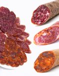 El salchichón ibérico de bellota elaborado con magros y grasas de cerdo ibérico picados en trozos muy finos, condimentados con sal, pimienta, nuez moscada, orégano y ajo que están embutidos en tripa natural.