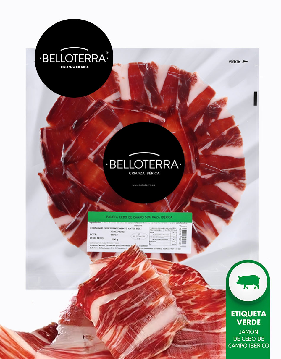 Paleta ibérico 50% de Cebo de Campo elaborado de forma artesanal por Belloterra, empresa tradicional de Pozoblanco (Córdoba) que cuenta con una producción propia de cerdos ibéricos puros y extensas dehesas de encinas, quejigos y alcornoques, en las que sus cerdos se crían y engordan en libertad, aprovechando los recursos naturales que este ecosistema ofrece la dehesa fuera del periodo de montanera (de marzo a septiembre), fundamentalmente pastos naturales y acompañados de piensos de cereales.