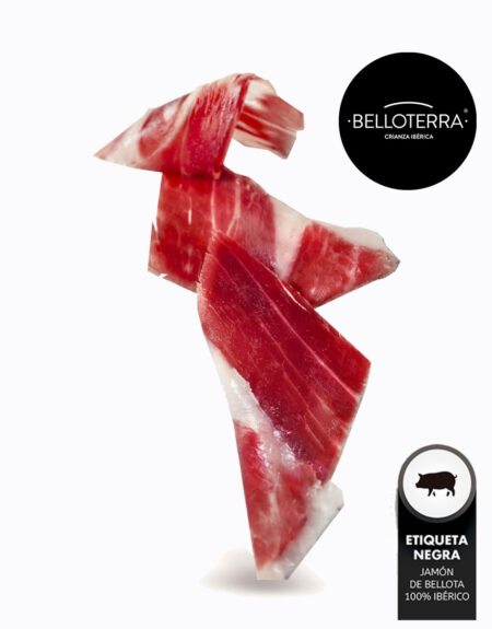 Pieza obtenida de un cerdo 100% raza ibérica cuya alimentación se realiza en nuestras dehesas a base de bellotas y hierba exclusivamente. Se identifica Precinto y vitola de color negro con el logotipo de la Norma de Calidad del Ibérico junto a la categoría de Bellota 100% Ibérico.